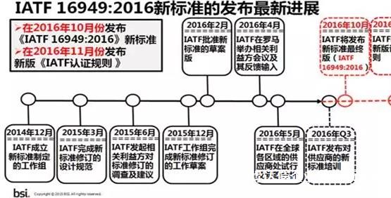 2016年8月9日,ISO組織和IATF共同發(fā)布消息: IATF 16949:2016將取代當前的ISO/TS 16949:2009標準,規(guī)范汽車行業(yè)各組織質(zhì)量管理體系的各項要求。該標準將依據(jù)并參考最新版本的ISO質(zhì)量管理體系標準ISO 9001:2015。正式標準預計將于今年10月正式發(fā)布。