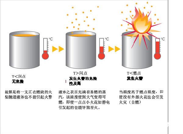 易燃性 (或可燃性) 是與化學材料相關的最常見的物理危害。對閃點的了解,可燃液體的特性及與燃點的不同,其它特性都對于化學材料的可燃的風險意識起著重要的作用。閃點及燃點都是一個溫度值,并且都與著火的可能性相關。閃點溫度,是指有點火源的情況下,并且在敞開的液體容器上有足夠的空氣時,燃燒便會發生。燃點溫度 (遠高于閃點溫度),是指當時環境產生的熱量足夠點燃材料。例如在實際操作中,如果化學液體的閃點低于工廠典型溫度(例如<35攝氏度) , 對這些化學品的儲儲和使用要特別加以關注。