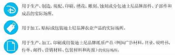 ?用于生產不包含、結合或應用迪士尼知識產權的空白或一般產品、部件或材料的場所(例如空白或一般的紙板箱、塑料包裝膜或空白紐扣)。但是,僅可在“允許采購的國家/地區”中生產和從中采購這類空白物品和其他材料,并且不得向“受禁人員”采購。迪士尼鼓勵您僅從執行與《迪士尼準則》相當并與迪士尼政策一致的標準的來源購買所有產品、部件和材料。